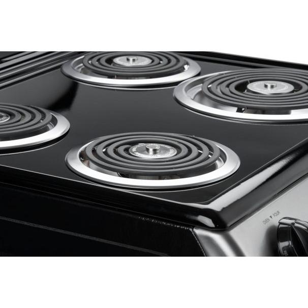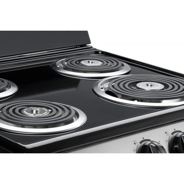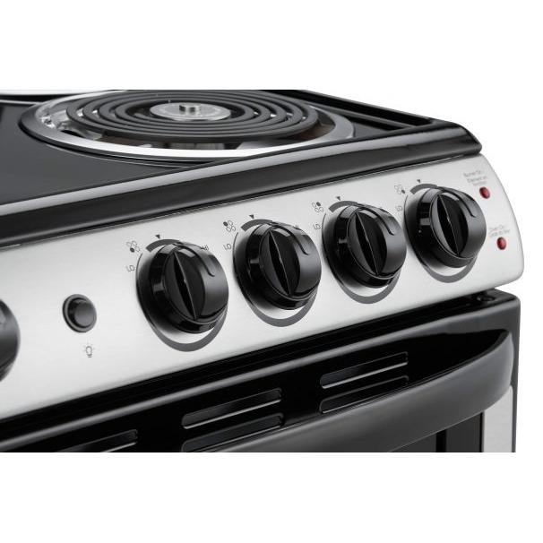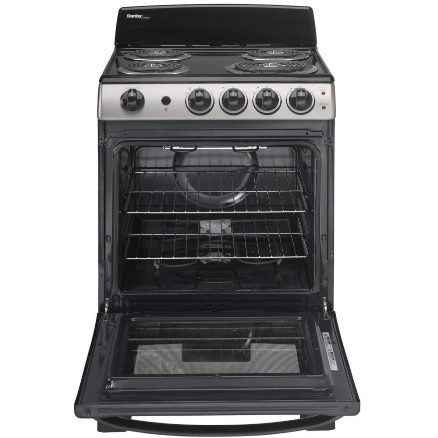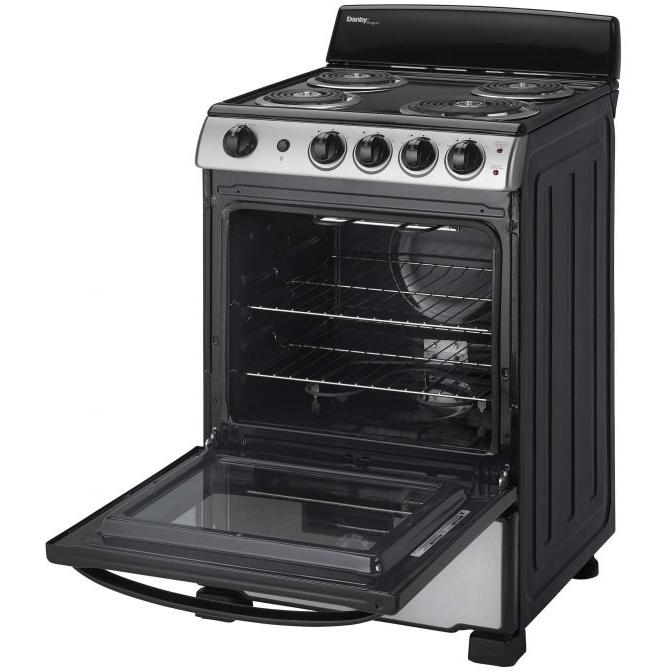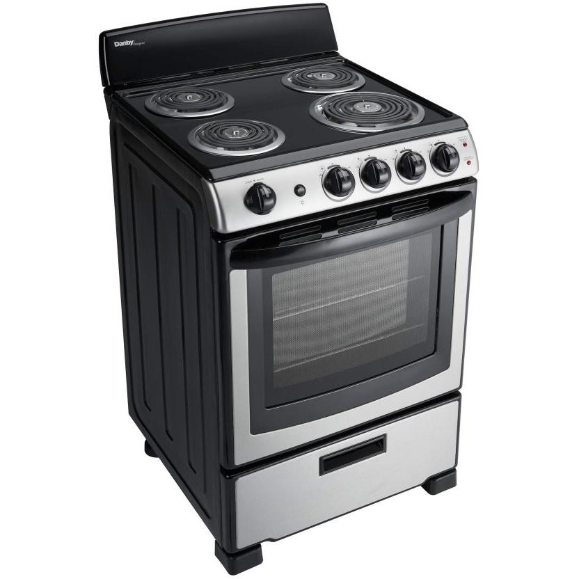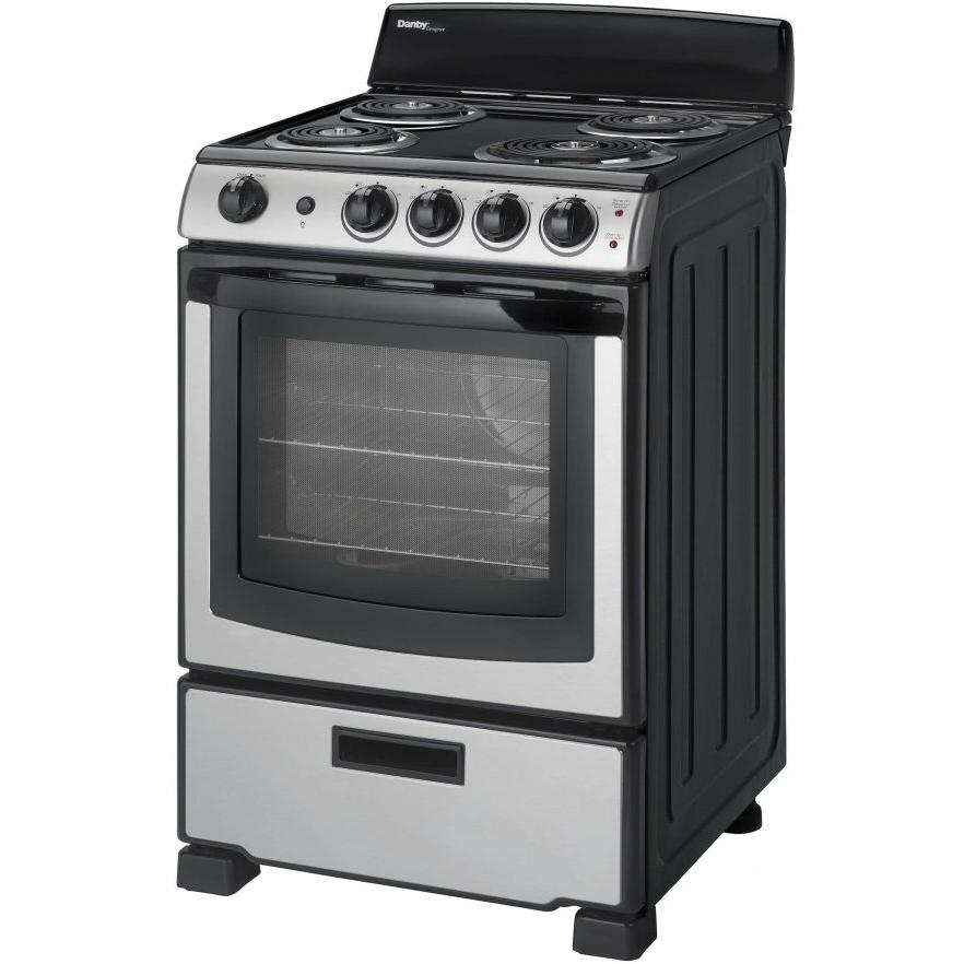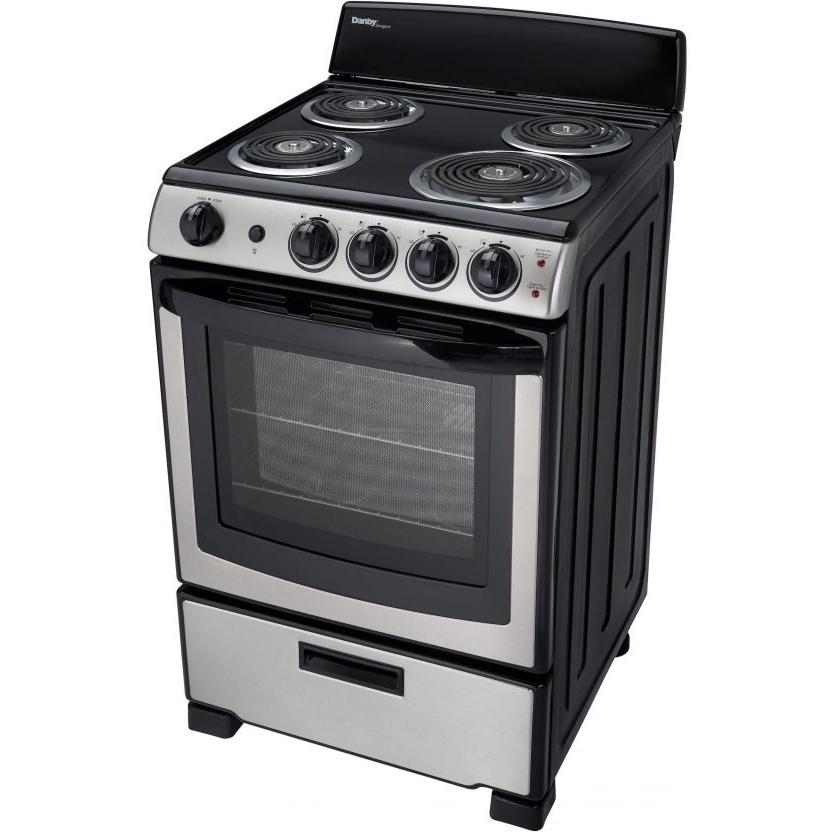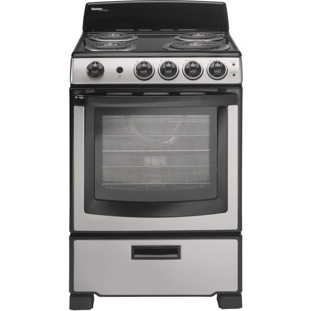 Danby Designer 24" Stainless Steel Free Standing Electric Coil Range. You don’t need to be a world-class chef to enjoy cooking with this compact electric range by Danby. This attractive stainless steel model may only be 24-inches wide, but it comes with everything you need for fine dining. This includes an oven and four burners: one eight-inch coil element and three six-inch. This trendy appliance provides 2.9 cubic feet of oven space making it ideal for smaller apartments or cottages. It boasts a spill-proof easy-to-clean porcelain cooking top. The oven temperature range is between 250°F and 500°F while the broiler can dish out 2,400 watts of power. This dependable electric range comes with push-and-turn knobs for added safety and includes two oven racks with four adjustable positions and safety stops for optimal cooking. An extra-large view window with interior light allows you to keep an eye on your food while it bakes.