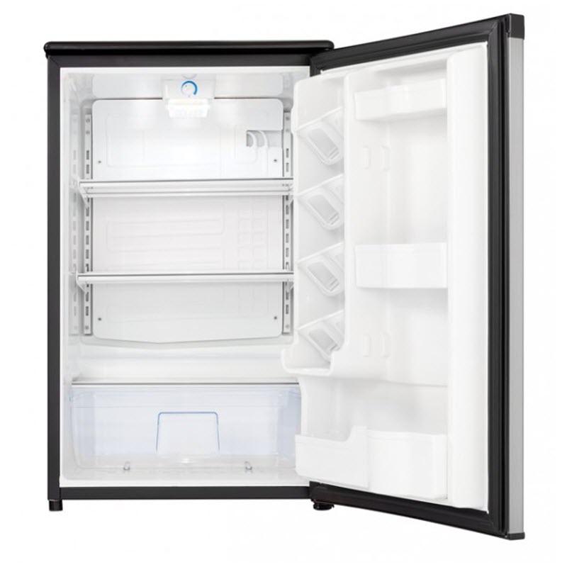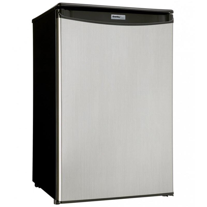 This Danby Designer 4.4 cu. ft. compact refrigerator is the perfect size for dorm room and small spaces. Featuring Integrated door shelving with tall bottle storage, CanStor® beverage dispensing system, and mechanical thermostat. The spotless-steel door, black cabinet, and integrated door handle provide a beautiful contemporary look and the smart scratch-resistant work-top is an ideal place to store accessories.