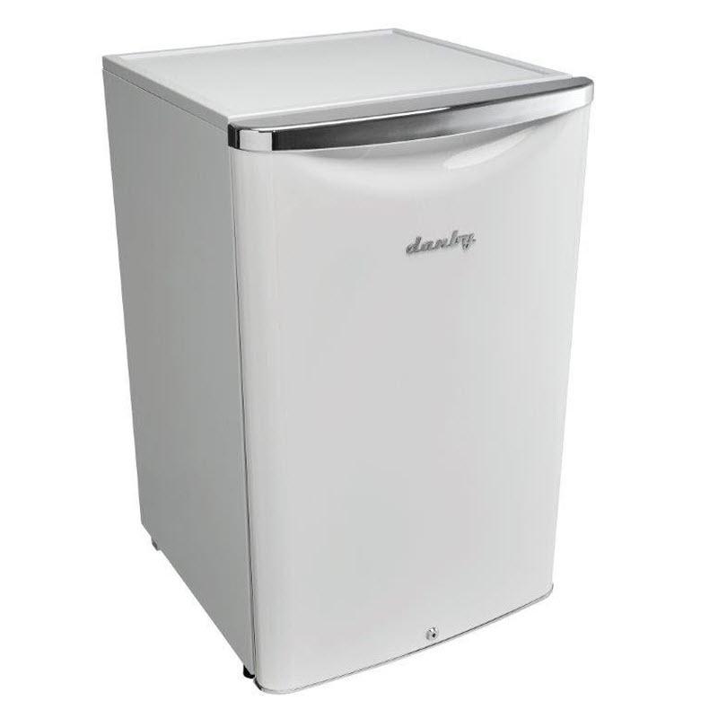 Danby Contemporary Classic collection 4.4 cu. ft. capacity compact all refrigerator. Drawing inspiration from mid-century styling and simplicity to reimagine retro for the modern consumer. Featuring interior white LED light, a vegetable crisper with glass top, CanStor® beverage dispensing system and integrated door shelving with tall bottle storage.
