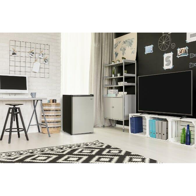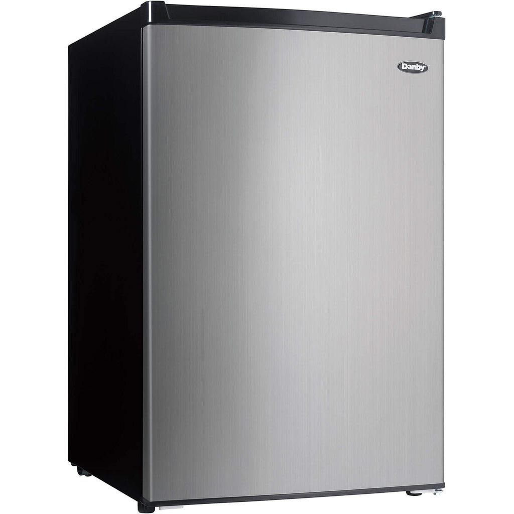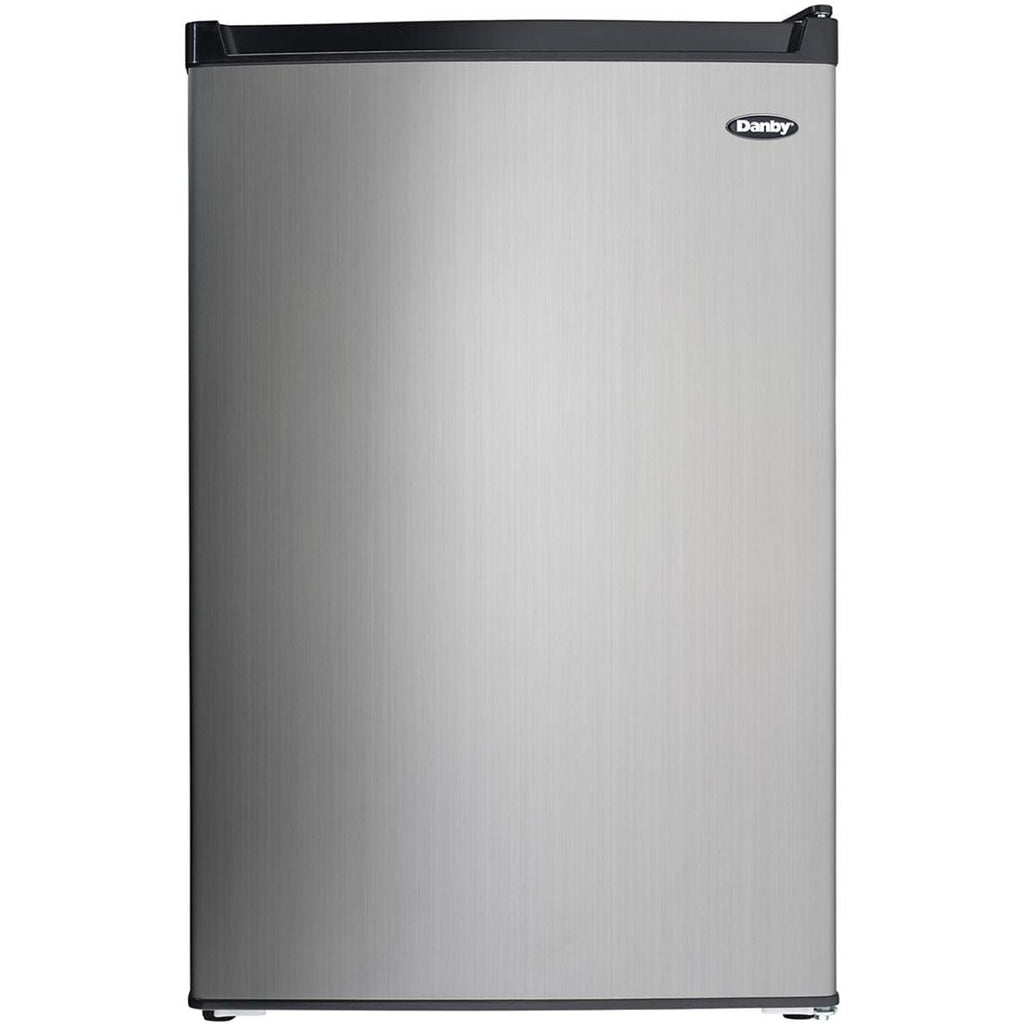 Danby 4.5 cu. ft. Compact Refrigerator with True Freezer in Stainless Steel. This compact refrigerator by Danby offers 4.5 cubic feet capacity with a sleek stainless steel finish. It includes a full-width true freezer section (operates at -18°C) to ensure your ice cream and perishables are kept frozen and comes Energy Star rated. The reversible door and smooth-back design allow this unit to fit neatly against a wall or in a corner. And the adjustable glass shelves make clean up easy if spills occur. Perfect for dorms, offices, or rec rooms, this Danby compact refrigerator with true freezer is the ultimate single-door mini fridge.