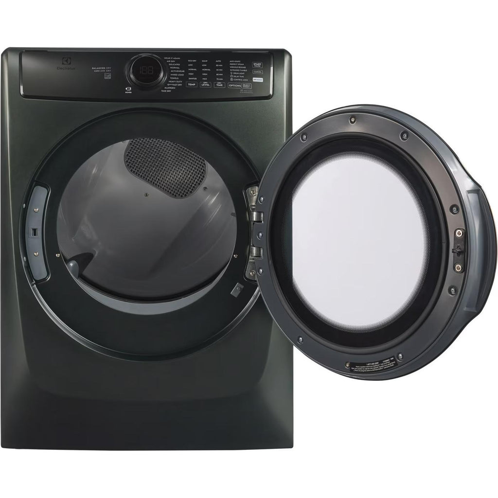 The Electrolux front load electric dryer with Balanced Dry technology prevents temperature spikes to keep fabrics cooler throughout the dry cycle. LuxCare Dry uses an advanced moisture sensor to prevent over or under-drying. The Electrolux Perfect Steam electric dryer with Predictive Dry has a more precise sensor to protect fabrics from overdrying. The Wear It Again cycle refreshes fabrics by using steam and tumble to remove pet hair, reduce odors, and reduce wrinkles in just 15 minutes.