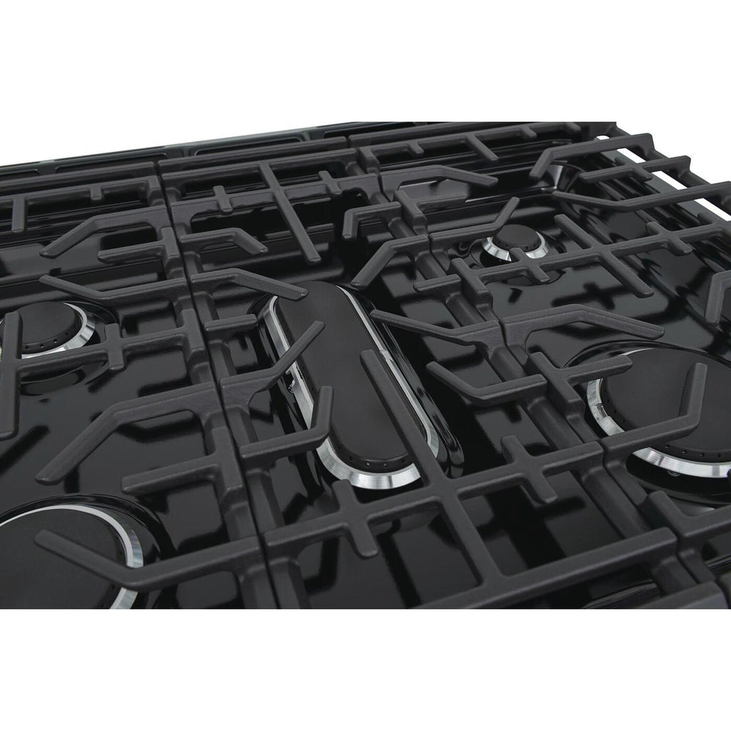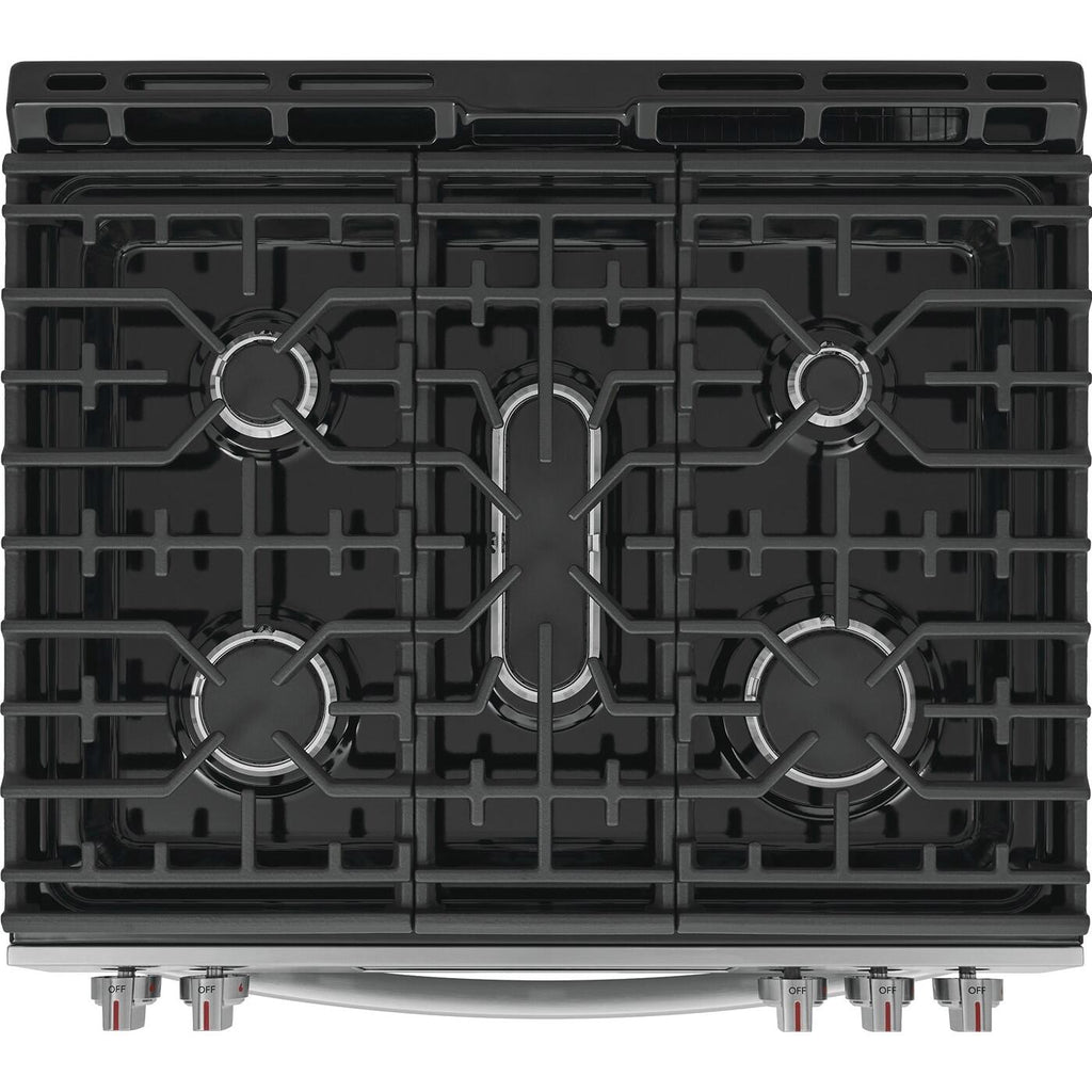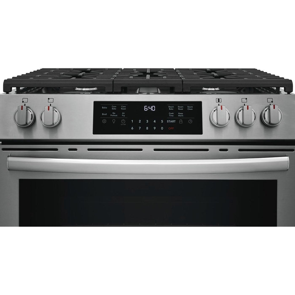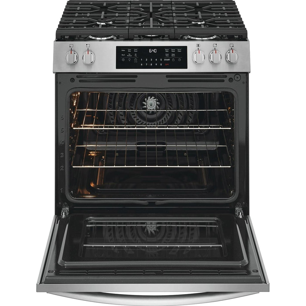 The Frigidaire Gallery 30" Front Control Gas Range combines advanced cooking technology with versatile features. Its Total Convection system offers multiple cooking modes, including Air Fry, No Preheat, Slow Cook, Steam Bake, and more. The spacious 6.0 cu. ft. oven is complemented by a five-burner cooktop, featuring an 18,000 BTU Quick Boil Burner and a central oval burner with an integrated cast iron griddle.