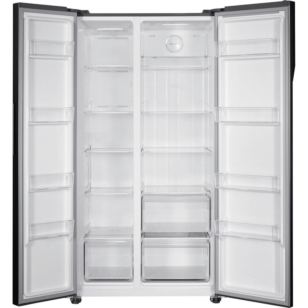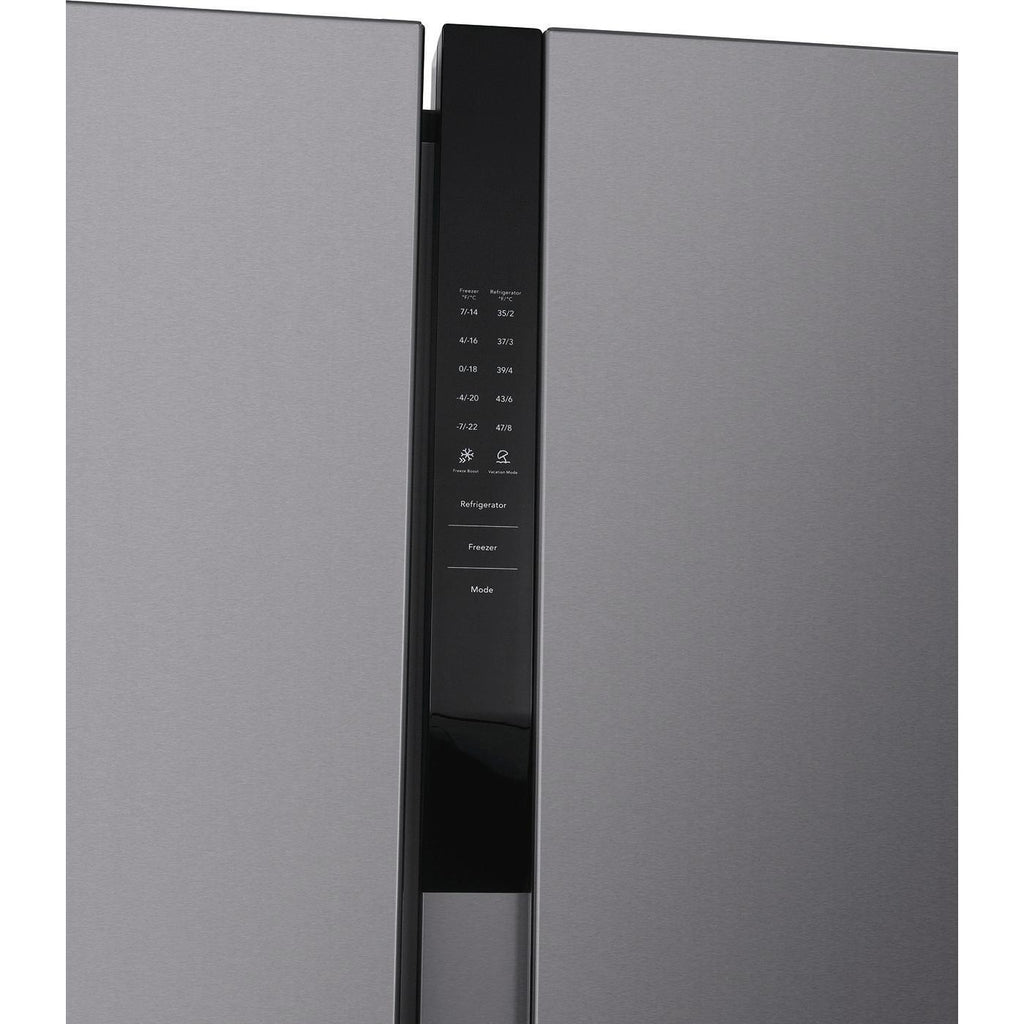 The Frigidaire 36-inch, 21.4 cu. ft. Counter-Depth Side-by-Side Refrigerator offers a sleek, space-saving design perfect for modern kitchens. Its counter-depth feature ensures a flush fit with your cabinetry, creating a streamlined look. Inside, LED lighting illuminates the spacious compartments, making it easy to find what you need.