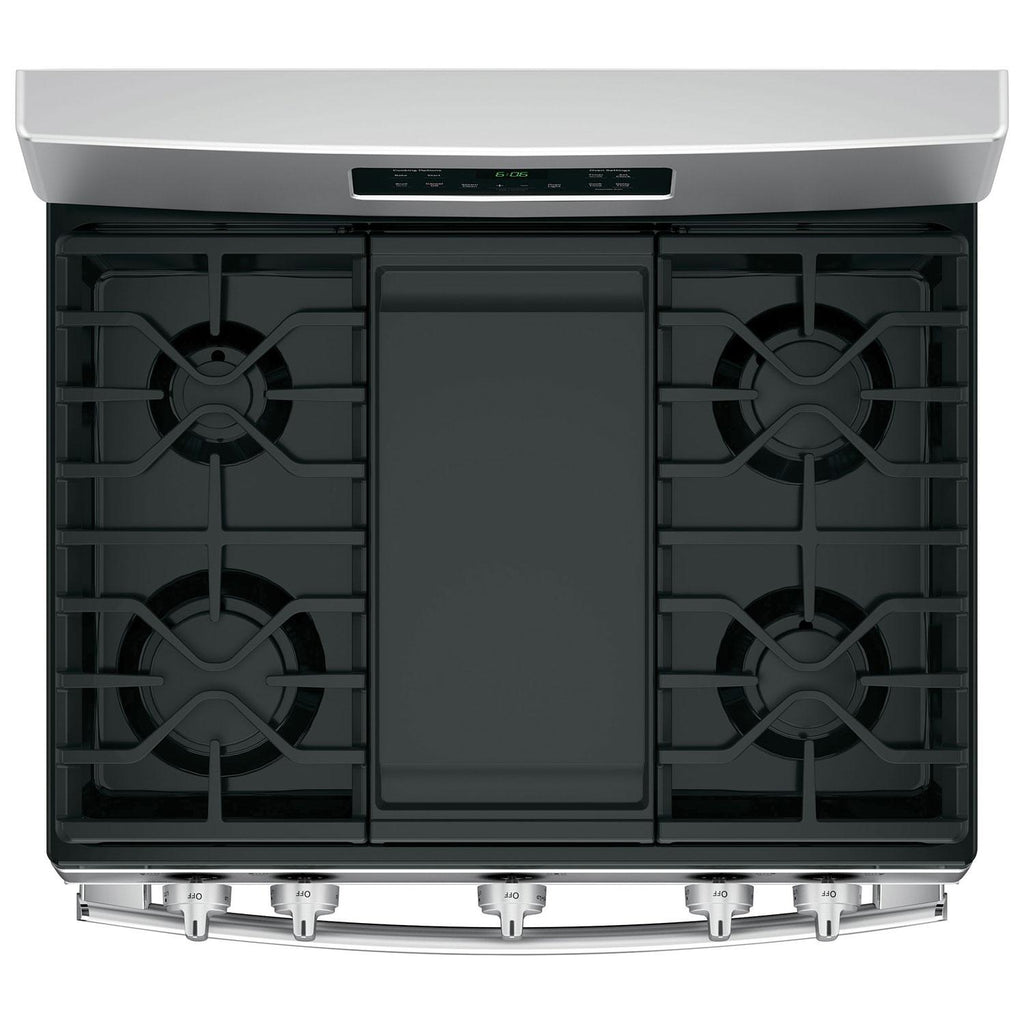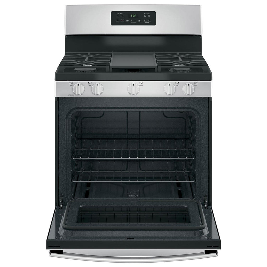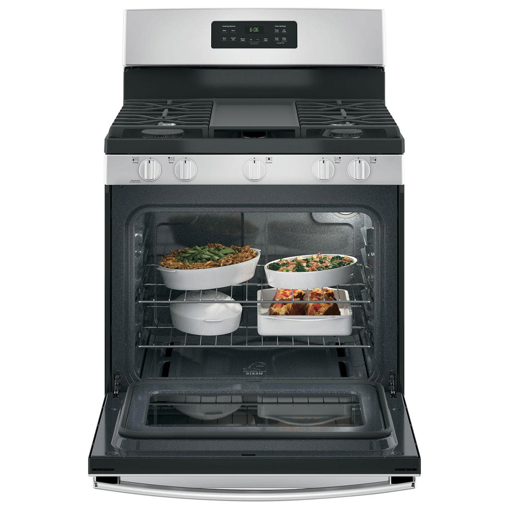 This GE 30" freestanding steam clean gas range with a 5.0 cu. ft. oven capacity offers a spacious cavity for baking and broiling multiple dishes at once, while the sealed gas burners offer instant heat and precise simmering. When it's time for cleanup, don't sweat thanks to the one-piece cooktop and Steam Clean option.