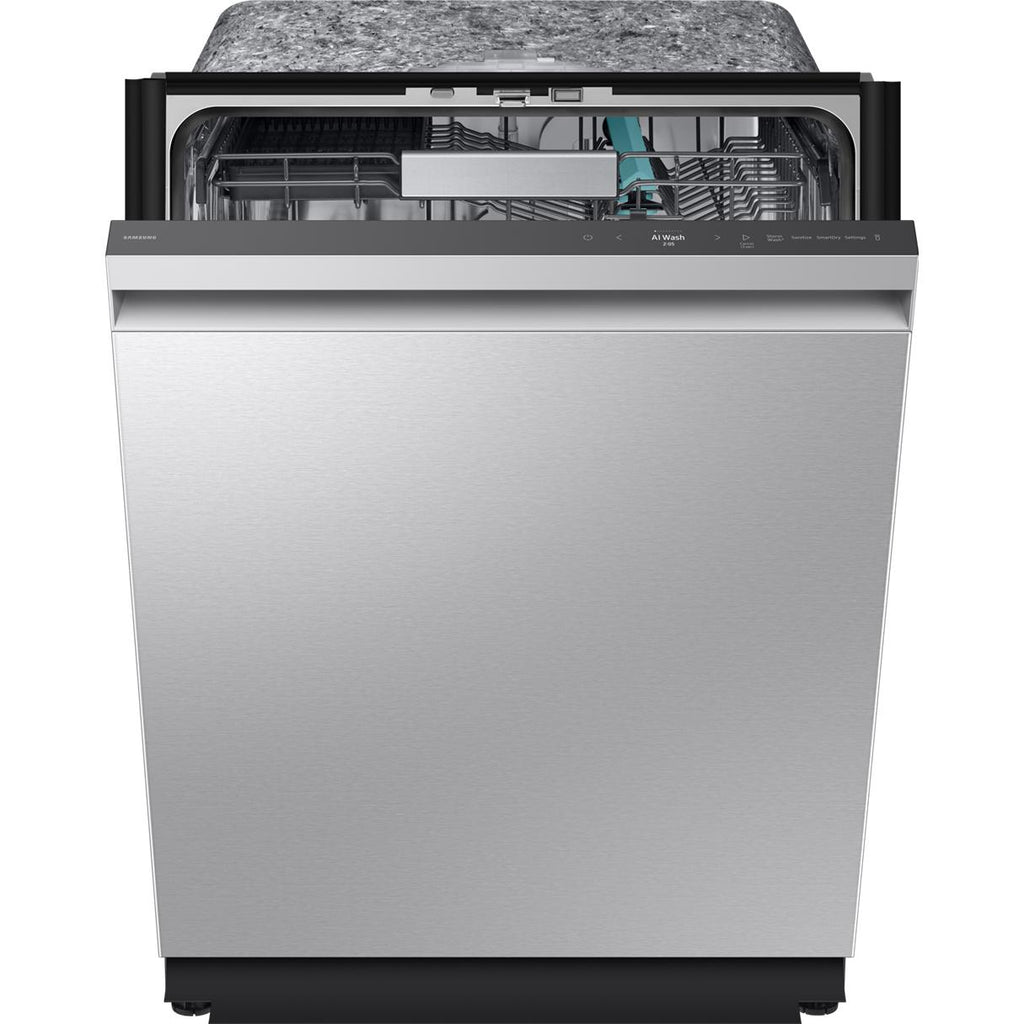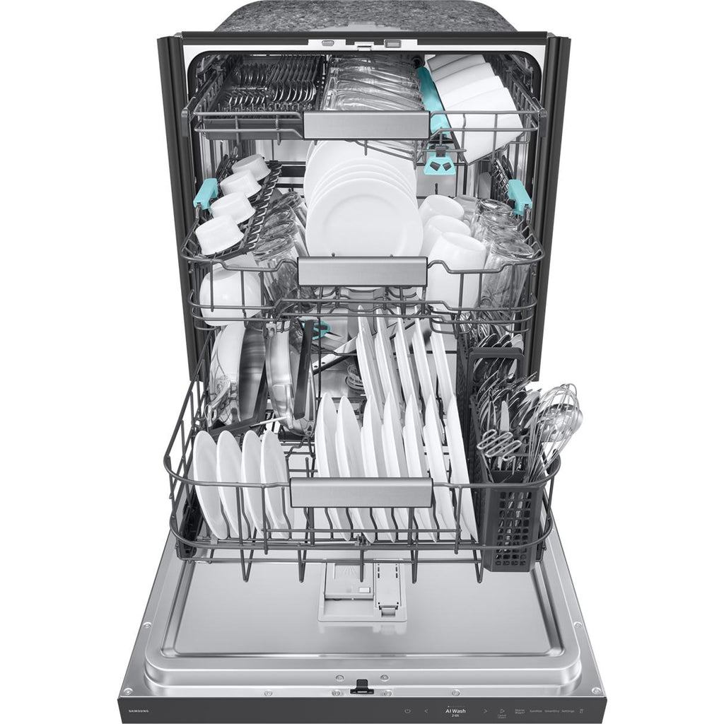 Samsung 24-inch Built-In Extra Quiet (38dBA) Dishwasher with AI Wash and upgraded 3rd Rack. Clean dishes effortlessly and efficiently. AI Wash uses a new high-resolution turbidity sensor and machine learning algorithm. It intelligently adjusts the washing and rinsing cycles to clean dishes and remove even stubborn leftover food and sticky residue without pre-rinsing.